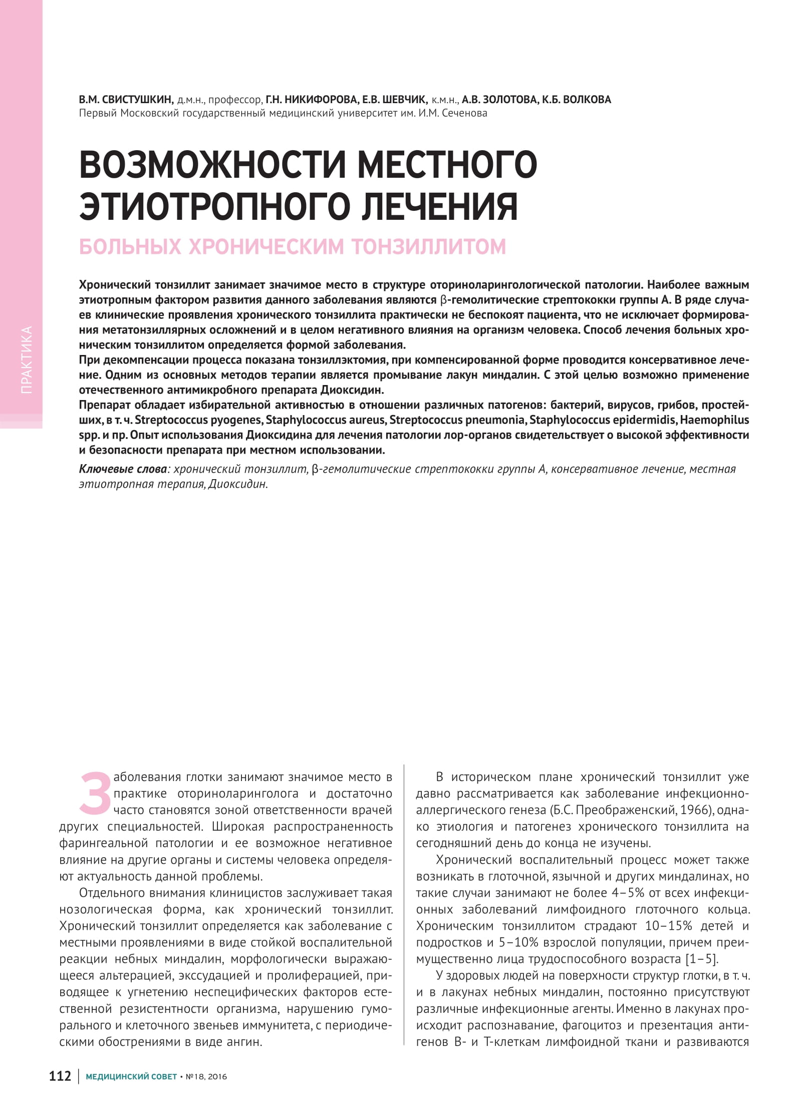 ВОЗМОЖНОСТИ МЕСТНОГО ЭТИОТРОПНОГО ЛЕЧЕНИЯ БОЛЬНЫХ ХРОНИЧЕСКИМ ТОНЗИЛЛИТОМ